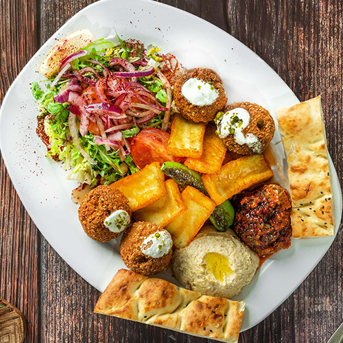 Kombination aus Falafel und Halloumi mit Meze, Salat und Hummus
